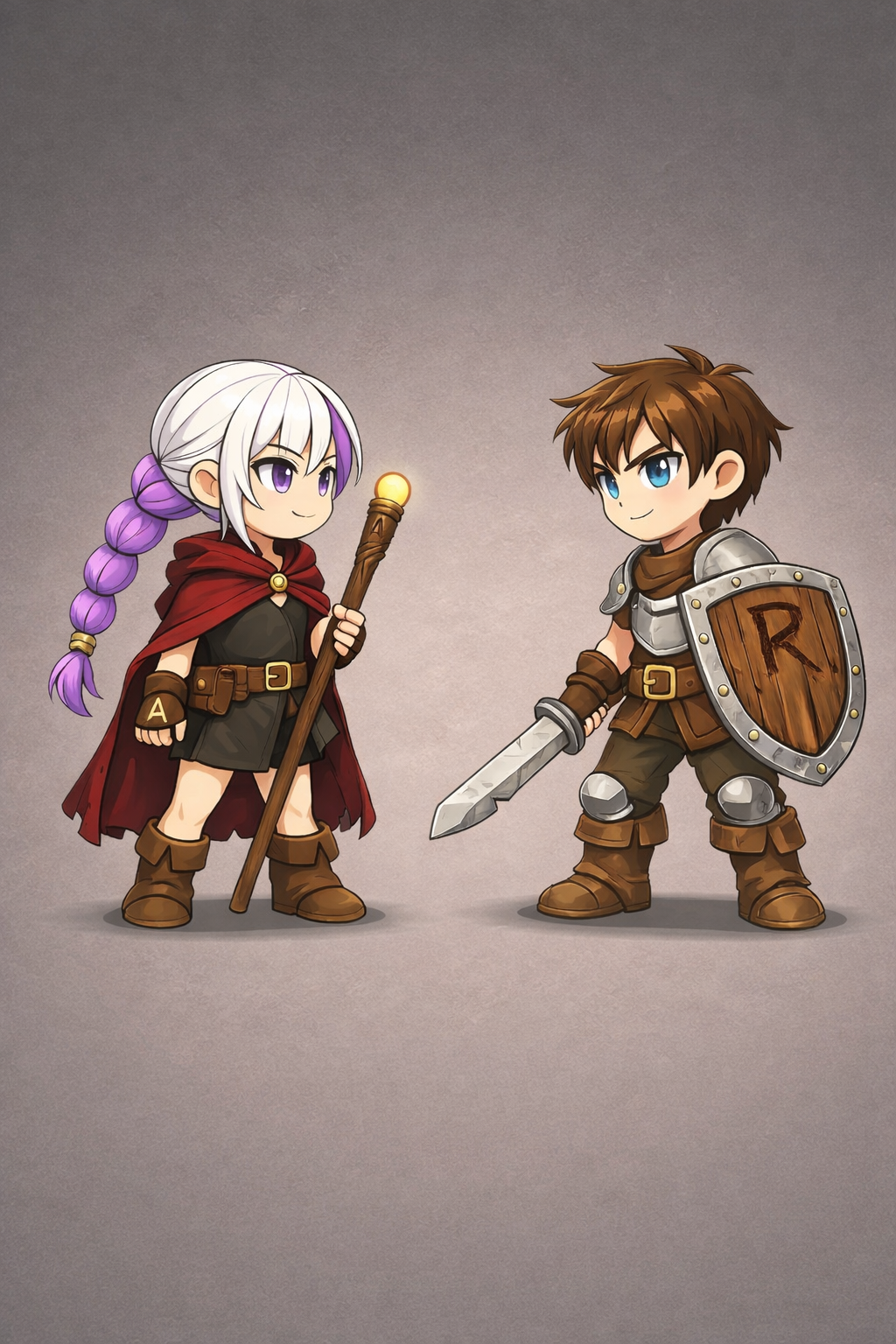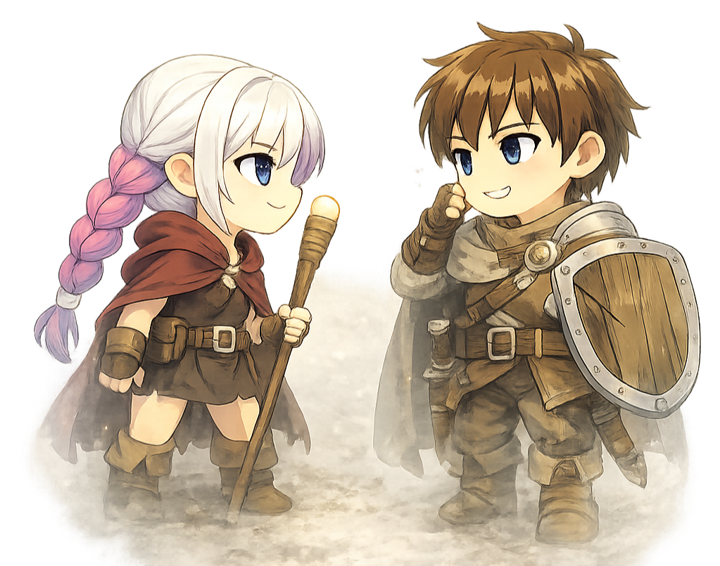 Two unknown adventurers crossed paths at the edge of a quiet town — one with a battered shield, the other a simple staff that was mostly a walking stick…